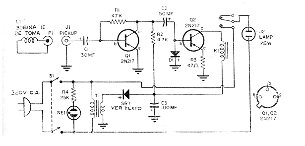 Este circuito es de una Radio Chassi Television Argentina del año 1964, el circuito emplea transistores de germanio, pero se puede intentar una versión con transistores de silicio como el BC558 y el cambio en algunos resistores. El transformador debe tener un secundario de 6 V con al menos 250 mA. El circuito sólo funciona con líneas analógicas antiguas y la bobina captadora colocada debajo del teléfono debe tener unas 1.000 espiras de hilo bien fino.