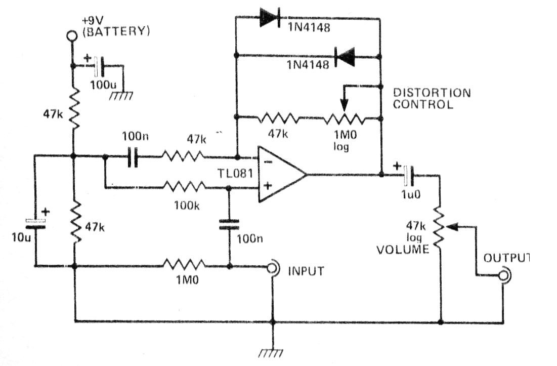 Este circuito produce el efecto borroso cuando se combina entre la guitarra y la entrada del amplificador. La fuente de alimentación del operario, que puede ser un 741 es una batería de 9 V, ya que el consumo de la unidad es muy bajo, lo que garantiza una buena durabilidad para esta fuente de energía. Los cables de entrada y salida de señal deben ser blindados.