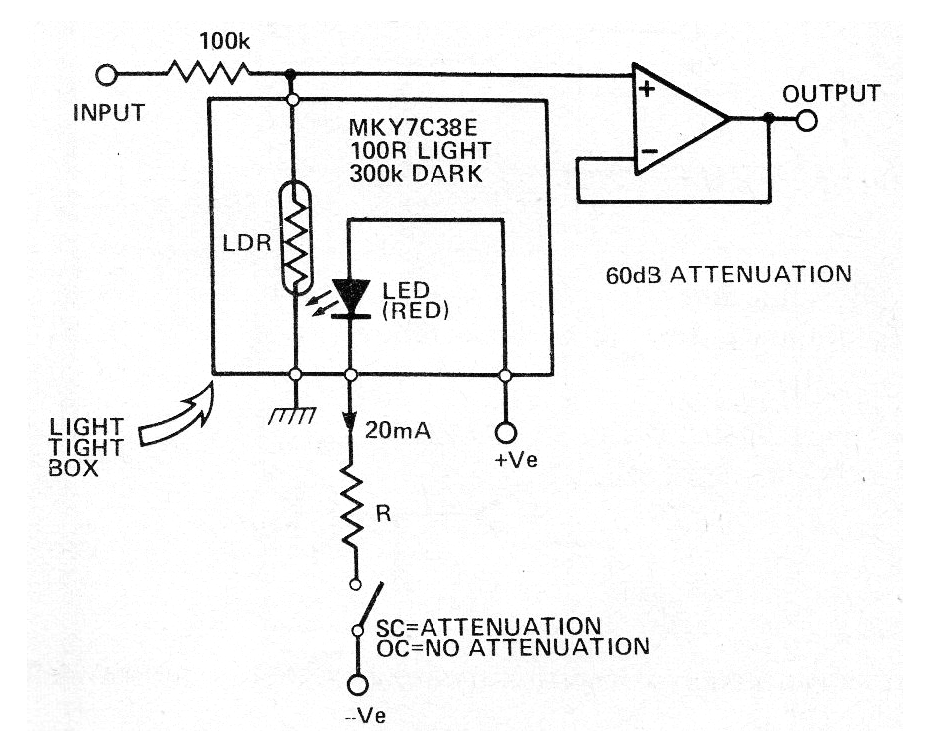 Este circuito permite conmutar electrónicamente una señal de audio utilizando un LDR y un LED. Cuando el LED se excita, el LDR presenta baja resistencia impidiendo que la señal de audio pase por el circuito. El LED debe montarse junto al LDR en una cámara cerrada. El amplificador operacional puede ser de cualquier tipo.