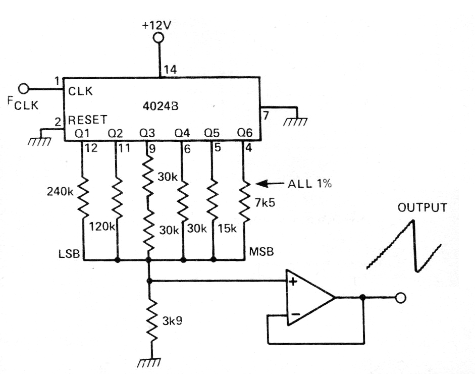 El circuito presentado genera una señal en escalera cuya frecuencia depende de la señal de entrada, siendo entonces dividida por 64, pues la escalera tiene 64 escalones. El circuito puede ser alimentado por tensiones de 5 a 15 V y la frecuencia máxima de entrada es de algunos megahertz. La precisión de la escalera depende de los componentes utilizados. El amplificador operacional puede ser el 741 u otro. En ese circuito opera como seguidor de tensión.