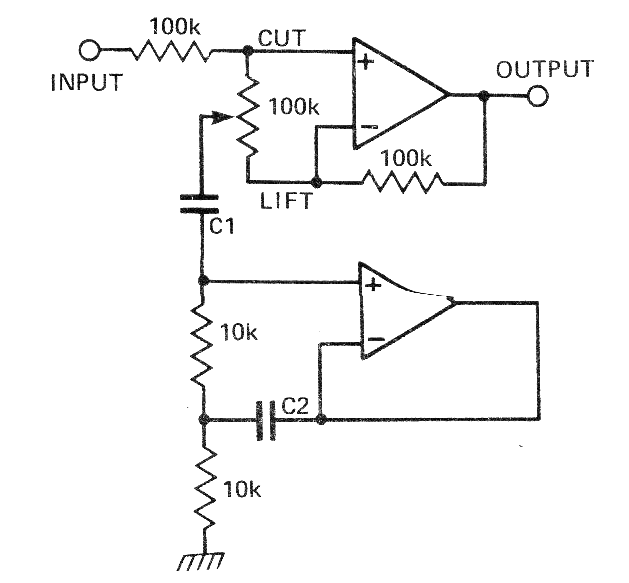 Utilizando dos operativos comunes, como el 741, este circuito sirve de control de medios en un amplificador. La fuente de alimentación debe ser simétrica y el circuito se intercalará entre la fuente de señal y la entrada del amplificador. Los cables de señal deben ser blindados.