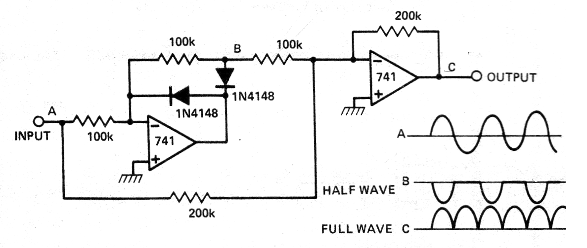 Este circuito rectifica señales senoidales de baja tensión para efecto de medida, pues el circuito es de baja potencia. Los amplificadores operacionales utilizados deben ser alimentados por una fuente simétrica de 6 a 12 V. Otros amplificadores operativos se pueden utilizar.
