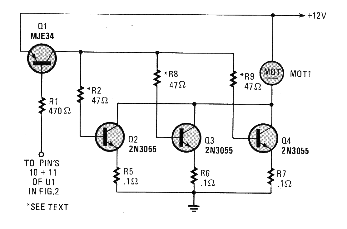 Este circuito se obtuvo en una revista Popular de noviembre de 1991, pero es actual, ya que todos los componentes son comunes. Sólo el MJE34 es que puede ser reemplazado por un TIP32. El transistor Q2 debe estar dotado de radiador y el motor debe tener una corriente máxima de 20 A. La alimentación puede oscilar entre 5 y 12 V. Eventualmente C1 debe cambiarse si el motor tiende a vibrar en ciertas bandas de velocidad. La resistencia R1 se puede cambiar en función de la corriente del motor controlado. La entrada es una señal de control PWM, como por ejemplo el CIR10304S.