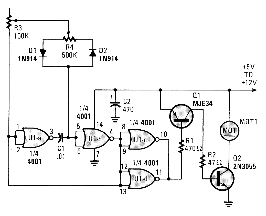 Este circuito se obtuvo en una revista Popular de noviembre de 1991, pero es actual, ya que todos los componentes son comunes. Sólo el MJE34 es que puede ser reemplazado por un BD136. El transistor Q2 debe estar dotado de radiador y el motor debe tener una corriente máxima de 4 A. La alimentación puede oscilar entre 5 y 12 V. Eventualmente C1 debe cambiarse si el motor tiende a vibrar en ciertas bandas de velocidad.