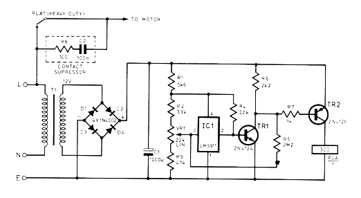 He encontrado este circuito en una revista inglesa de 1979, pero el circuito todavía se puede montar fácilmente con un BC548 para TR1 y BD136 para TR2. El sensor es que puede ser un poco más difícil de obtener, ya que se trata del circuito integrado LM3911 de National Semiconductor. El circuito acciona un relé cuando la temperatura ajustada sobrepasa cierto valor. Este relé controla el sistema de refrigeración.