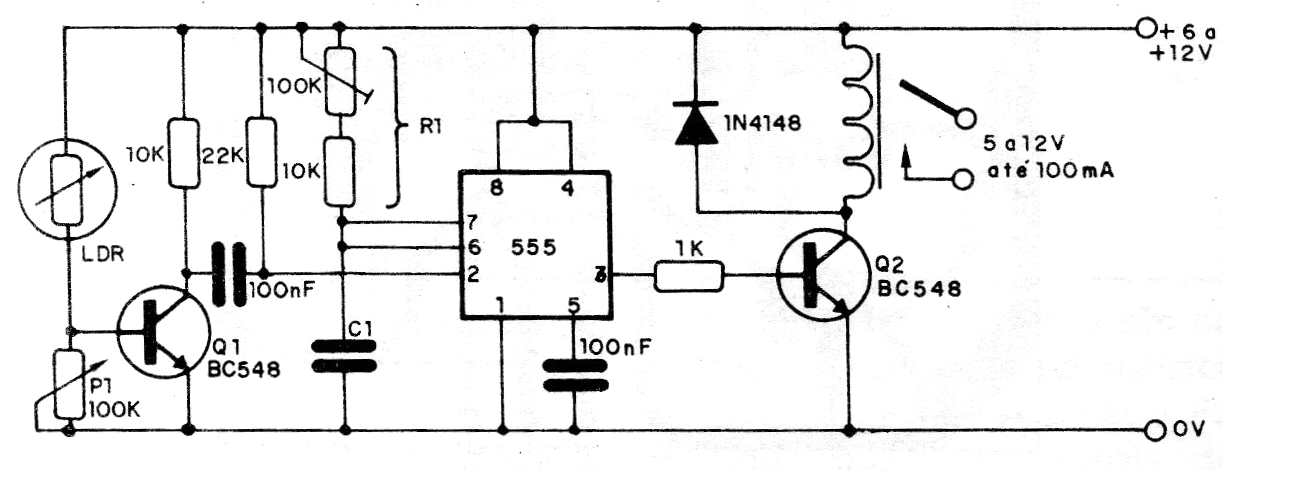 Un breve flash de luz en el LDR hace que el relé dispare y así permanezca por un intervalo de tiempo determinado por el ajuste de R1 y el valor del condensador C1. C1 puede tener de 10 uF para algunos segundos, hasta 1 000 uF para cerca de 15 minutos. El mismo es válido para R1 que puede tener de 100k a 1 M. El circuito puede ser alimentado por tensiones de 6 a 12 V, conforme el relé y el LDR puede ser instalado en un tubo con lente para mayor sensibilidad y directividad. Los relés sensibles son los indicados para esta aplicación.