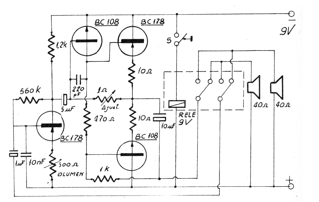 Este circuito fue obtenido en una publicación argentina de los años 1970. El circuito todavía puede ser montado con la utilización de transistores equivalentes modernos. Podemos utilizar el BC548 en lugar del BC108 y el BC558 en lugar del BC178. También podemos utilizar un altavoz de 8 ohmios con un pequeño transformador de salida de audio de 100 a 200 ohms de primario y 8 ohms de secundaria. El circuito puede ser alimentado por pilas o fuente de 9 V con al menos 100 mA.