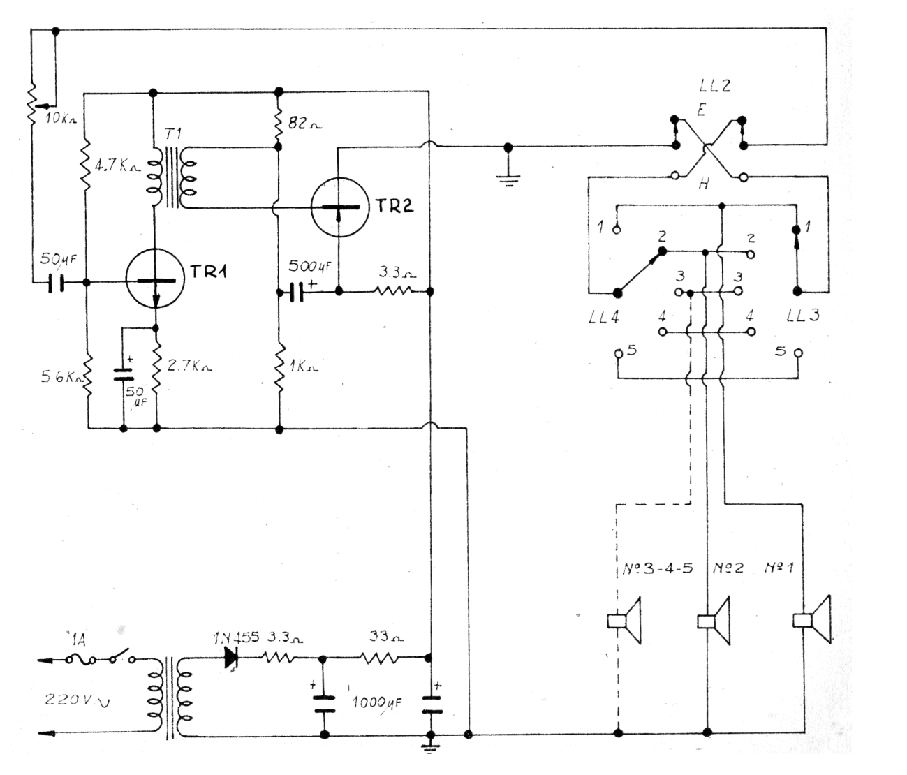 Este circuito fue obtenido en una publicación argentina de los años 1970. Puede todavía ser montado utilizando para TR1 un BD135 y para TR2 un BD136. El transformador puede ser del tipo de salida encontrado en radios transistorizados antiguos. Dependiendo del transformador, pueden ser necesarios cambios en los valores de las resistencias. La fuente tiene un transformador con 6 V x 250 mA y el rectificador puede ser el 1N4002.
