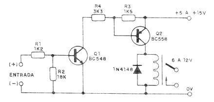 Este circuito de shield ultra-sensible utiliza transistores complementarios para accionar un relé. El relé puede tener una bobina de hasta 100 mA y tensiones de accionamiento en el rango de 5 a 15 V. Las corrientes mayores de accionamiento se pueden obtener con un BD136 en lugar de Q2. La corriente llegará a 500 mA, en este caso. El accionamiento se realiza con una señal positiva de entrada.