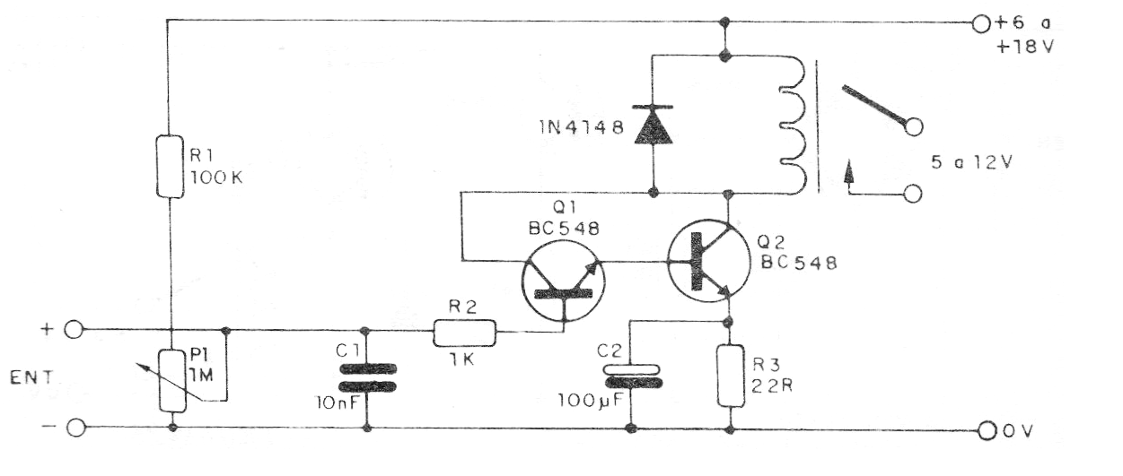 Este circuito de shield utiliza dos transistores NPN comunes de uso general en la configuración de Darlington para obtener una alta ganancia en la excitación de un relé. El circuito posee un control de ganancia y puede excitar relés de 5 a 12 V con corrientes de bobina hasta 100 mA. Para corrientes mayores, hasta 500 mA, Q2 puede ser reemplazado por un BD135. La entrada de señal es continua.