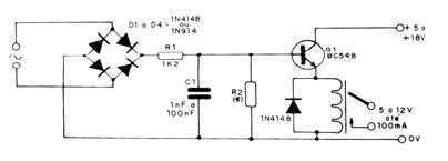 Con este circuito es posible excitar relés de corriente continua a partir de una señal alternada, ya sea de la red de baja tensión (secundaria de un transformador) o de audio. El resistor R1 depende de la tensión de la señal de entrada, siendo de 1k2 para señales hasta 6 V. La corriente máxima del relé es 100 mA y R2 depende de la intensidad de la señal teniendo valores típicamente entre 1k y 22k. El circuito es de una publicación de Newton C. Braga. Para corrientes mayores que 100 mA utilice el BD135 (hasta 500 mA).