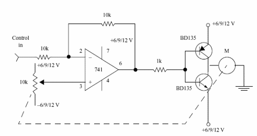 En la figura tenemos el modo de hacer un simple servo con un motor y caja de reducción, teniendo como base un circuito integrado 741. La tensión de control determina la posición del motor. El motor puede tener hasta 500 mA y los transistores deben montarse en radiadores de calor. La fuente debe ser simétrica con tensión de acuerdo con el motor controlado. El circuito se obtuvo en una publicación mía en los Estados Unidos. La tensión de control varía en el rango de las tensiones de alimentación.