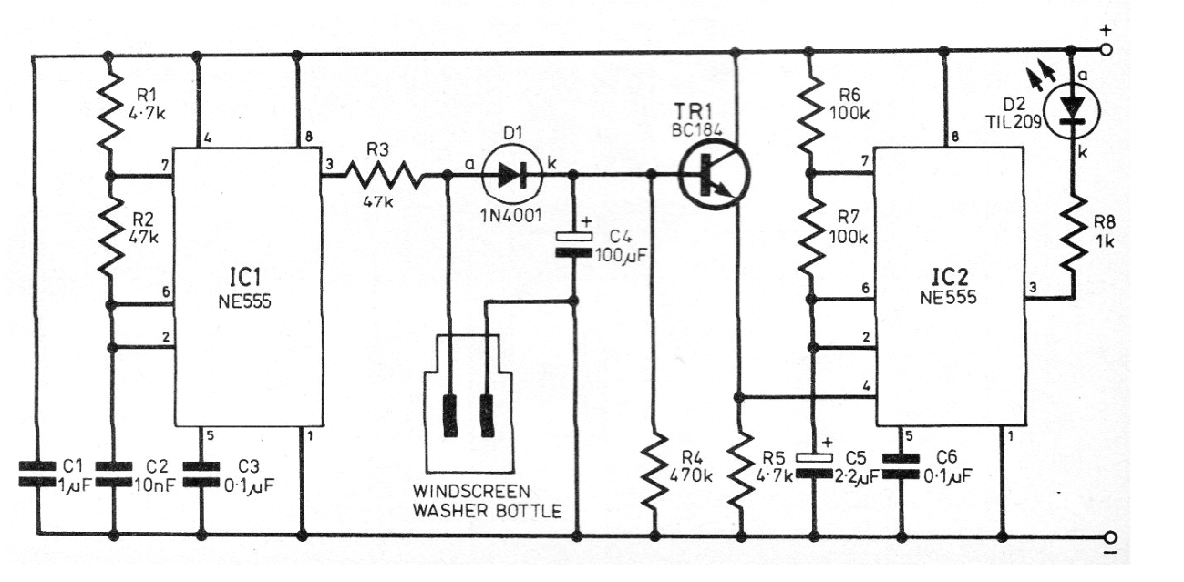 Este interesante circuito fue encontrado en una publicación inglesa de 1984, pero puede ser montado con facilidad, utilizando en lugar del transistor original un BC548. Se trata de un circuito que avisa cuando el depósito de agua del limpiador de parabrisas está vacío. La alimentación de 12 V viene del propio coche.