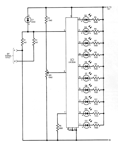 He encontrado este circuito en una publicación inglesa de 1984. El circuito sigue siendo actual, ya que utiliza el LM3934, circuito integrado bastante que todavía se puede encontrar en el mercado de componentes. La alimentación se puede hacer con tensiones de 3 a 12 V y los LED deben ser todos iguales, para una escala uniforme. La señal de entrada es de audio de baja intensidad.