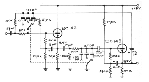 Este circuito fue obtenido en una publicación argentina de los años 1970. Se trata de un filtro que debe ser intercalado entre un tocadiscos y la entrada del promedio donde la señal va a ser grabada o reproducida. Permite cortar los ruidos de los discos viejos, ayudando en la recuperación de la grabación, por ejemplo, en MP3 o CD. El circuito debe ser alimentado con fuente de 18 V y tiene un consumo muy bajo. Los transistores pueden ser los BC548.
