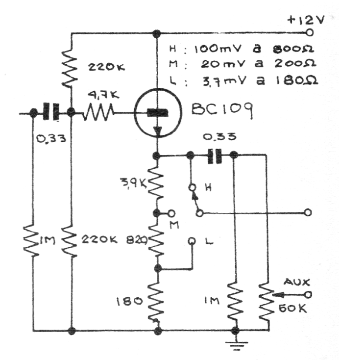 Este amplificador separador fue encontrado en una publicación argentina de los años 1970. Se trata de un adaptador de impedancia que posee una elevada impedancia de entrada y tres impedancias de salida seleccionadas por una llave. El circuito tiene un consumo muy bajo y se puede montar con el BC549. Los cables de entrada y salida de señales deben ser blindados.