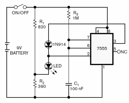 Este circuito utiliza el propio LED como sensor de luz para hacer su auto-accionamiento. Así, en el claro el LED permanece apagado y en la oscuridad el LED parpadea en una frecuencia dada por C1 y R3. El consumo es muy bajo y el 555 utilizado es del tipo CMOS (7555).