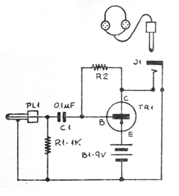 Este circuito está destinado a la amplificación de señales para auriculares piezoeléctricos o de cristal. Hemos logrado este circuito en una antigua publicación argentina de los años 1970. El transistor también funciona con auriculares magnéticos de impedancia por encima de 500 ohms. El resistor debe ser obtenido experimentalmente entre 22k y 220k según el auricular utilizado y el transistor, que puede ser un BC558 en lugar del tipo original de germanio.