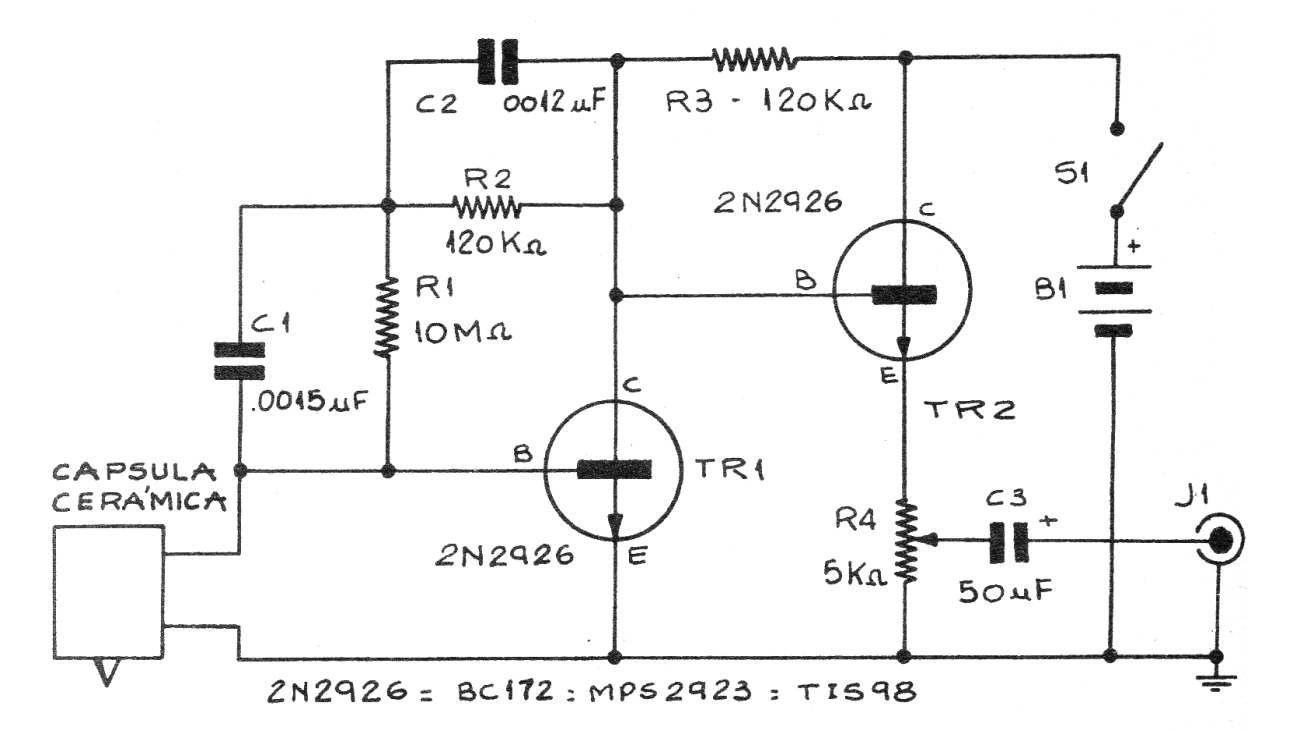 Este circuito fue sugerido originalmente por General Electric (GE) en una publicación de la década de 1970, Los transistores pueden ser sustituidos por equivalentes modernos como los BC548 y la alimentación hecha por una batería de 22,5 V o una fuente de alimentación simple, el consumo es muy bajo. El circuito cuenta con ecualización RIAA. Los cables de entrada y de salida de señal deben ser blindados.