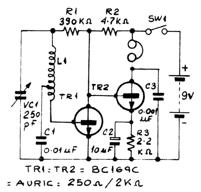 Este simple circuito de radio AM de dos transistores fue obtenido en una publicación argentina de los años 1970. El circuito funciona con tensiones de 3 a 12 V y la bobina consiste en 20 + 60 espiras de hilo 28 en un tubo de cartón de 1 cm de diámetro. El capacitor variable se puede obtener de una radio fuera de uso y el auricular debe tener de 600 ohms a 2k. En su defecto utilice un transductor piezoeléctrico con un resistor de 2k2 en paralelo. Los transistores pueden ser los BC548.