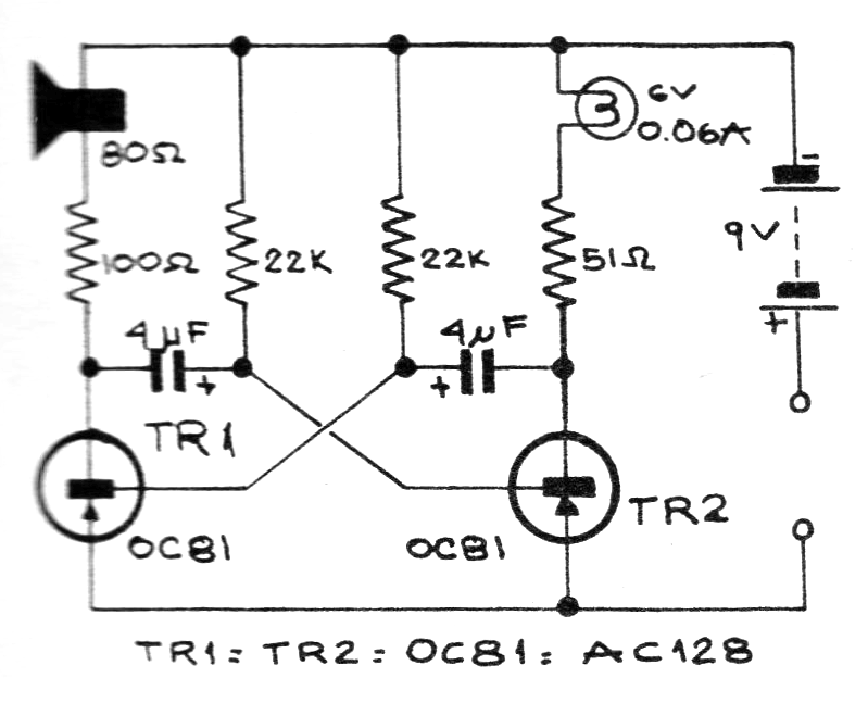 Este probador de continuidad, que consiste en un multivibrador astável, fue obtenido en una publicación argentina de la década de 1970. Los transistores pueden ser los BC558 y la alimentación puede ser hecha con tensiones de 6 a 9 V. Los capacitores pueden ser de 2,2 uF o 4,7 uF, ya que el valor de 4 uF ya no se encuentra. La lámpara es de baja corriente de 6 V y para la alimentación con esta tensión se puede extraer el resistor de 51 ohms.
