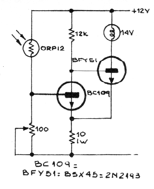 La idea básica de este circuito, encontrado en una revista argentina de la década de 1970 es simple: una lámpara ilumina el LDR, Ambos posicionados de tal forma que, cuando el parachoques del coche pasa entre ellos el circuito es accionado y una lámpara de advertencia se enciende . La lámpara de advertencia se encuentra en la pared delante del conductor. El circuito funciona con 12 V y la lámpara es de hasta 500 mA para transistores BD135 en lugar del BFY51 y BC548 para el lugar del BC109. El trimpot ajusta el punto de disparo.