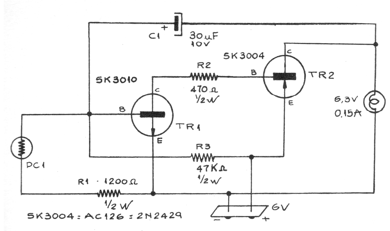 Este circuito hace que una lámpara incandescente parpadee en frecuencia determinada por el capacitor, cuyo valor puede quedar entre 20 (22 uF) y 220 uF. Los transistores admite equivalentes más modernos, pues obtuve este circuito de una publicación argentina de la década de 1970. Podemos usar el BC548 para el NPN y el BD136 para el PNP. La alimentación es de 6 V, pero podemos usar 12 V si la lámpara es cambiada por una de 12 V.