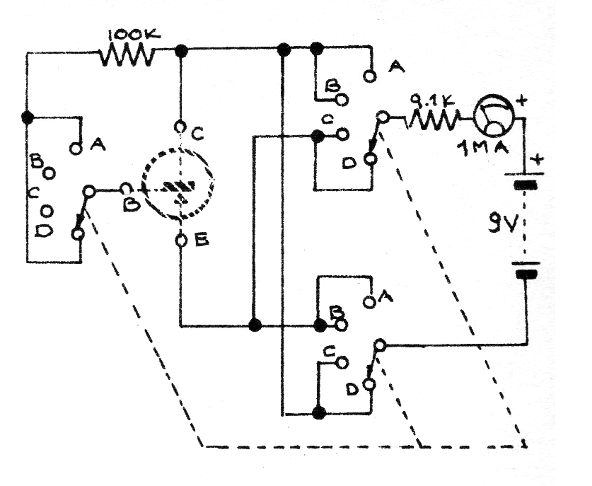 Este simple probador de transistores de uso general fue obtenido en una publicación argentina de la década de 1970. Con él podemos probar transistores NPN o PNP y más que eso, podemos identificar sus terminales, pues si el transistor está bien, la indicación correcta en el instrumento sólo se produce en una posición de las claves que permite identificarlos.