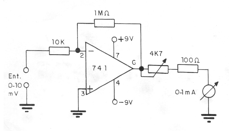 Utilizando un amplificador operacional 741 este circuito amplifica tensiones muy bajas posibilitando su medición en un multímetro común o miliamperímetro de 0 a 1 mA. La banda obtenida es de 0 a 10 mV y la fuente de alimentación debe ser simétrica, formada por dos baterías de 9 V. En realidad el circuito funcionará con fuentes simétricas de 6 a 12 V. Otros operacionales pueden ser utilizados y la resistencia de entrada es elevada.