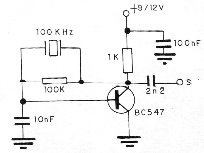 El circuito presentado produce una señal de frecuencia fija determinada por el cristal de 100 kHz. El circuito sirve de referencia para ajustes de instrumentos tales como osciloscopios y frecuencímetros. La alimentación debe ser hecha con tensiones de 9 a 12 V, proveniente de batería o fuente, ya que el consumo es bajo. Los capacitores deben ser cerámicos.