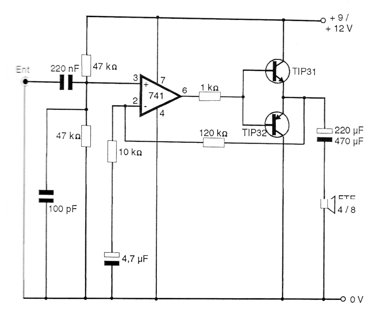 Agregando un paso de salida con transistores complementarios a un amplificador operacional se puede obtener una salida de algunos vatios con excelente calidad de sonido. Los transistores deben estar dotados de disipadores de calor y la ganancia depende de la resistencia de 120k ohms que puede cambiar. La fuente debe proporcionar una corriente de al menos 1 A.