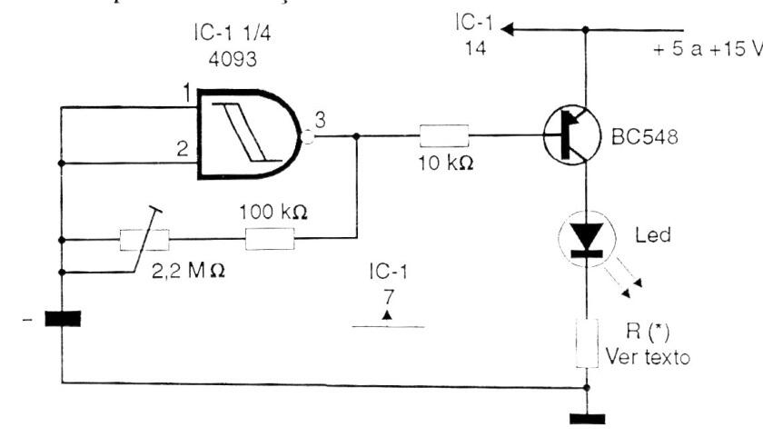 Este circuito excita uno o más LED que parpadean (a) en una frecuencia que se puede ajustar en el trimpot. El rango de frecuencias depende del condensador. Para LED de más de 200 mA, utilice un BD136, La alimentación puede estar entre 3 y 15 V. La resistencia R tiene su valor dependiente de la corriente y la cantidad de LED. Para 1 LED en 5 V utilice 330 ohmios y para 1 LED en 12 V utilice 1k.