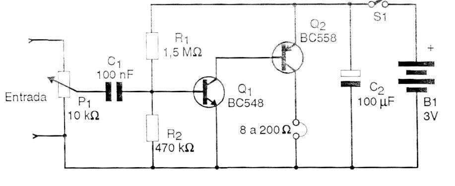 Este circuito consiste en un buen amplificador para auricular de baja impedancia, pudiendo servir como etapa de salida para radios experimentales, intercomunicadores, etc. El circuito puede ser alimentado por tensiones de 3 a 6 V y el resistorR2 debe ser obtenido experimentalmente en el rango de 47k a 470 k para obtener la mejor ganancia con la menor distorsión. Los pequeños altavoces también se pueden utilizar en la salida.