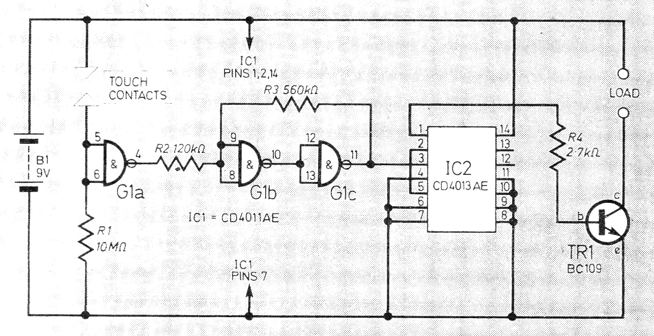 Este circuito fue obtenido en una revista inglesa de 1978, pero es perfectamente actual por la configuración que es de las más tradicionales. El transistor puede ser el BD135 para corrientes de hasta 500 mA y la alimentación se puede hacer con tensiones de 5 a 12 V. El circuito tiene una acción biestable. Para las corrientes de hasta 100 mA se puede utilizar el BC549, equivalente del BC109.