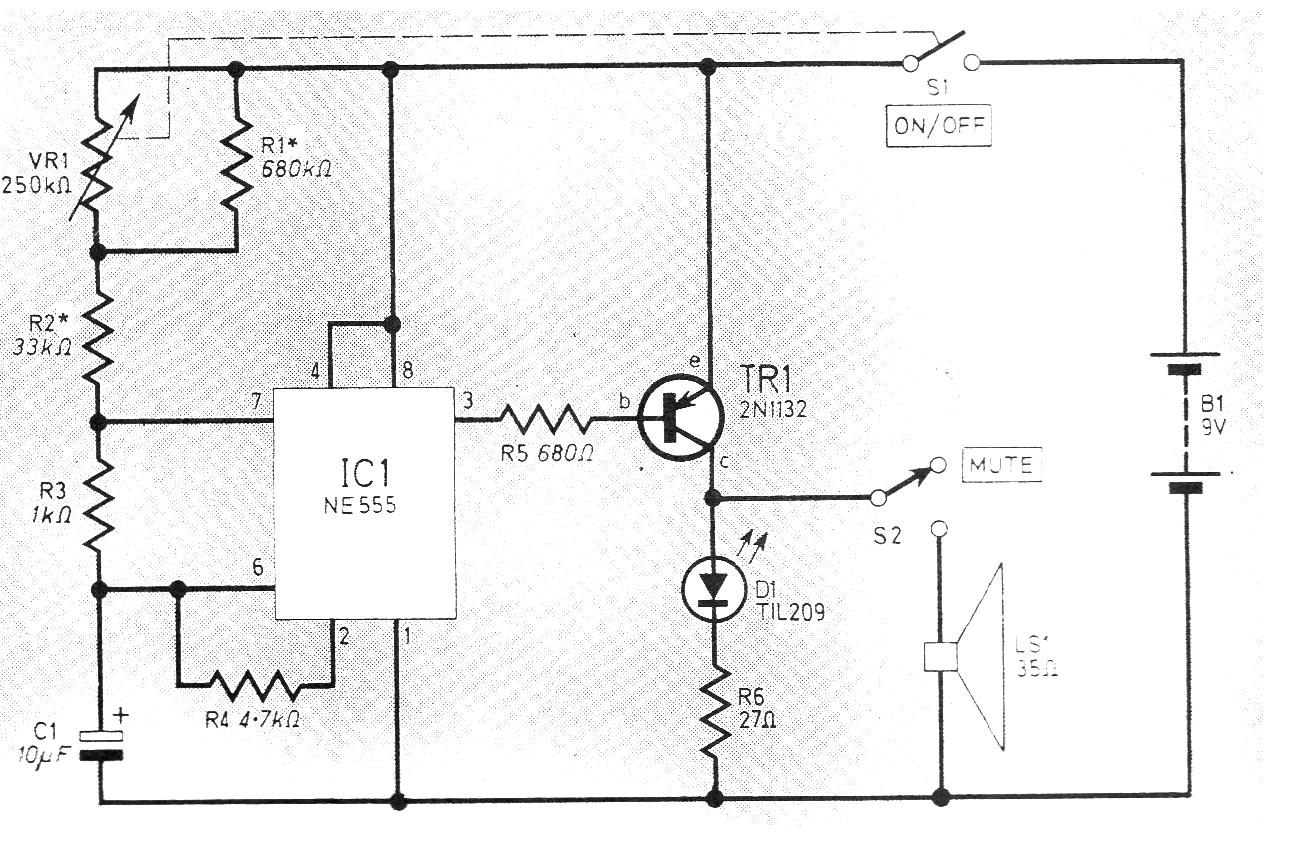 Este circuito fue obtenido en una revista inglesa de 1978, pero es perfectamente actual por la configuración que es de las más tradicionales. El transistor puede ser el BD136 y la alimentación se puede hacer con tensiones de 5 a 12 V. El circuito produce chascos audibles y parpadeados en el LED.