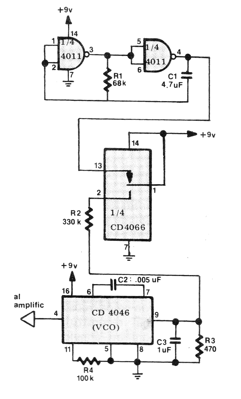 Este circuito fue obtenido en una revista Electrónica Fácil de Colombia de 1986. No sabemos si la revista todavía existe, pero el circuito puede ser montado con facilidad. El circuito genera una señal modulada que depende de C1 y C2. Estos componentes se pueden cambiar. La señal generada se debe aplicar a un amplificador y la fuente de alimentación debe ser simétrica de 6 a 9 V.