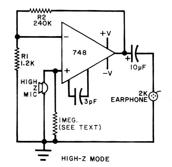Este circuito se ha encontrado en un Electronics Experimenter Handbook de 1979, pero es actual ya que utiliza el 741. Se trata de un preamplificador para micrófonos de alta impedancia. La ganancia es determinada por el resistor de realimentación y la fuente de alimentación debe ser simétrica de 6 a 9 V.