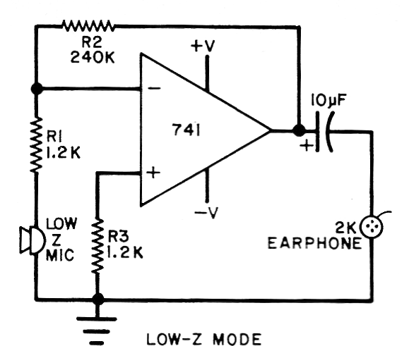 Este circuito fue encontrado en un Electronics Experimenter Handbook de 1979, pero es actual ya que utiliza el 741. Se trata de un preamplificador para micrófonos de baja impedancia. La ganancia es determinada por el resistor de realimentación y la fuente de alimentación debe ser simétrica de 6 a 9 V.