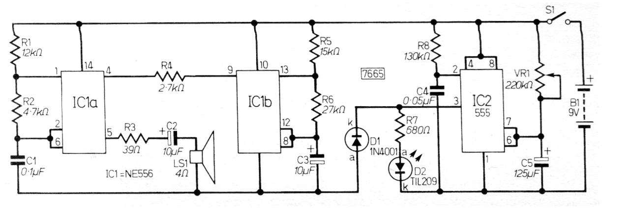 Este circuito fue encontrado en una publicación inglesa de 1982. Sin embargo, por sudar los circuitos integrados 555 todavía se puede montar fácilmente. Se trata de un temporizador originalmente diseñado para salas de revelado de fotos (cámaras oscuras). Su alimentación se puede hacer con tensiones de 6 V a 9 V. Observamos que el 556 es un doble 555.