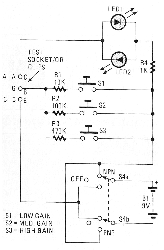 Este circuito se obtuvo en una revista Hands On Electronics de junio de 1987. Se rompe un circuito que indica en dos LED el estado de un diodo o transistor. El circuito puede ser alimentado por pilas o batería y prueba diodos y transistores de uso general.