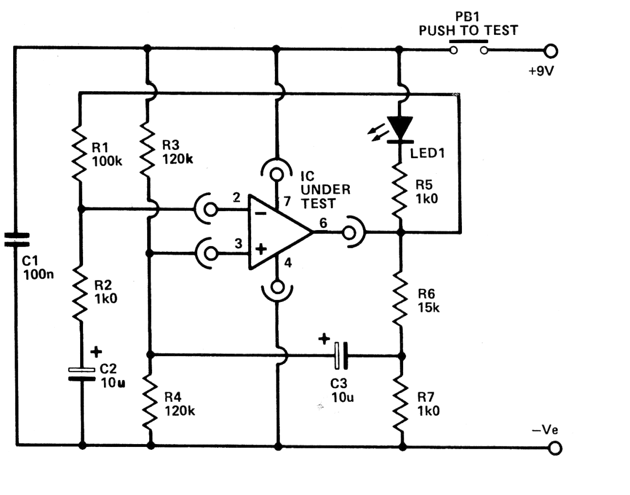 Este circuito fue obtenido en una revista inglesa de 1980, pero es actual, sirviendo para probar amplificadores operacionales comunes, como el 741, CA3140 e incluso comparadores como el LM339. Si el circuito de prueba está bien, el LED parpadea. La alimentación viene de una batería de 9 V.