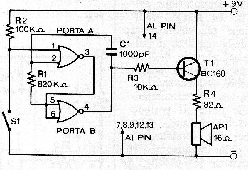 Este circuito es de una revista italiana Radio Elettronica de enero de 1977. El circuito muestra cómo implementar un circuito que produce sonidos de frecuencia determinada por el capacitor y reproducidos en un altavoz. La alimentación se puede hacer con tensiones de 5 a 12 V. Para tensiones de 5 y 6 C el transistor puede ser el BC558 y para tensiones mayores el BD136.