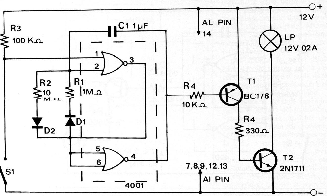 Este circuito es de una revista italiana Radio Elettronica de enero de 1977. El circuito muestra cómo implementar un astable CMOS con puertas NOR 4001 con control de ciclo activo accionando una etapa de potencia para excitar una lámpara. El intervalo de los intermitentes es dado por R2 y la duración por R1. T1 puede ser el BC558 y T2 el BD135. El circuito también puede ser alimentado por 6 V con lámparas para esta tensión. El disparo o accionamiento es hecho por S1.