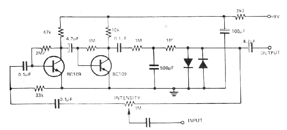 Este circuito fue encontrado en una revista inglesa de 1977. Este circuito se intercalado entre un captador de guitarra o una guitarra para producir un efecto de distorsión. La alimentación puede ser hecha por batería, pues el consumo es muy bajo. Los cables de entrada y de salida de las señales deben ser blindados.