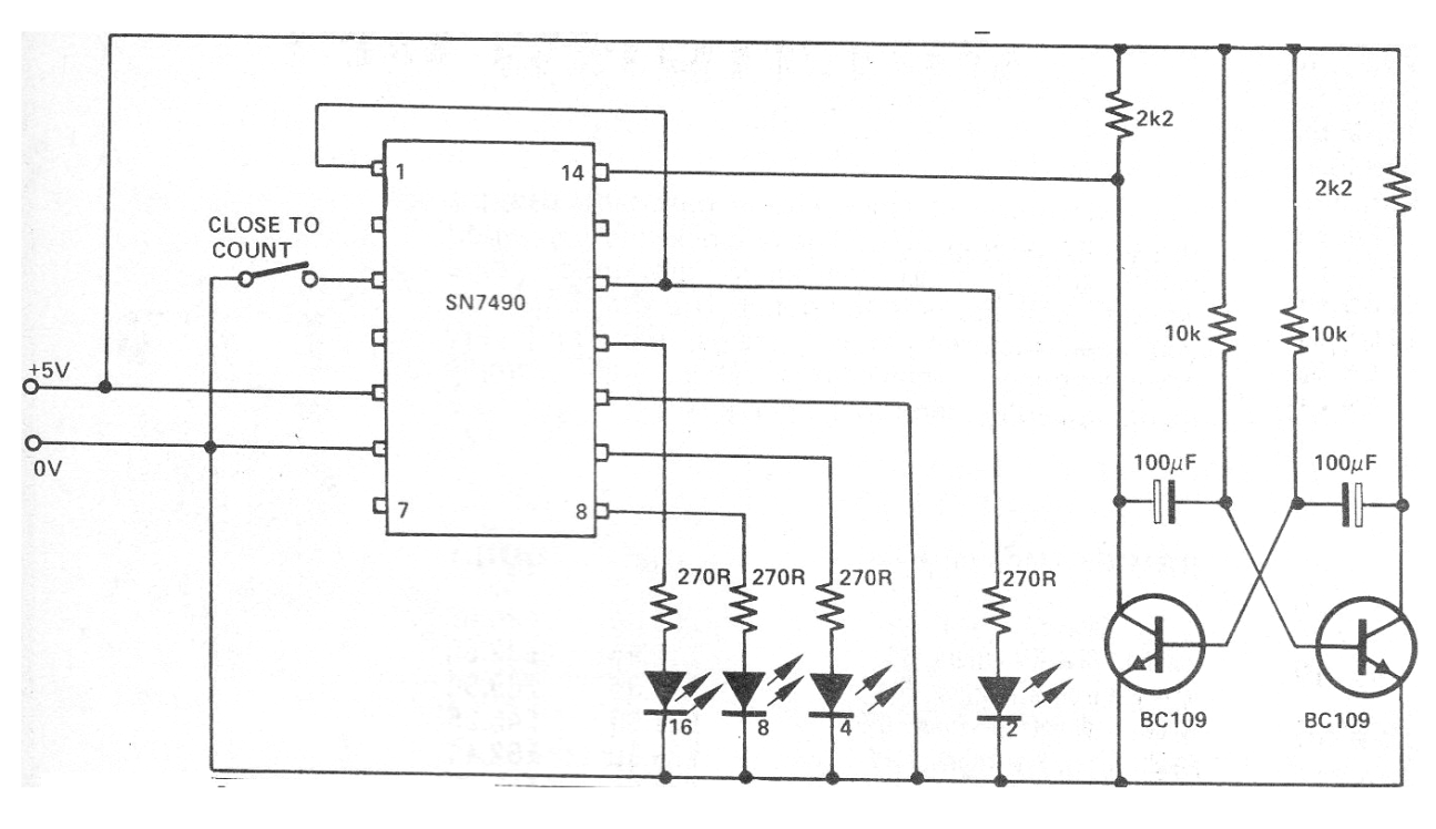 Este circuito fue encontrado en una revista inglesa de 1977. Este circuito tiene finalidad didáctica, contando pulsos y presentando en forma binaria a través de 4 LED. El circuito es TTL debiendo ser alimentado por una tensión de 5 V. Los transistores pueden ser los BC548. Los capacitores determinan la velocidad con que los pulsos contados van siendo producidos.
