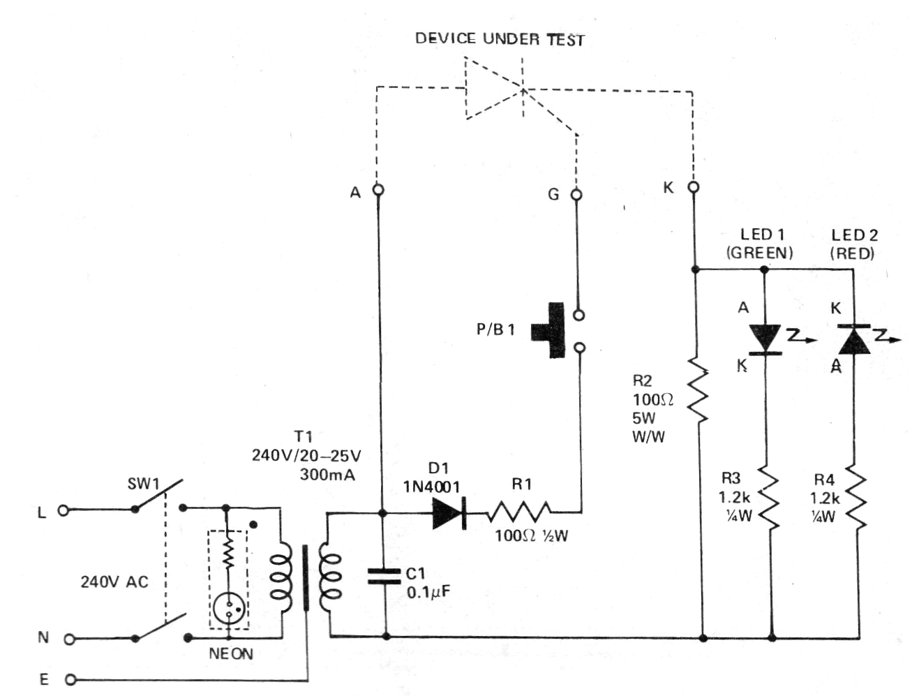 Este circuito fue encontrado en una revista inglesa de 1977. El circuito se puede utilizar para probar SCRs de la serie 106, que son los más comunes y más sensibles. La indicación es dada por el encendido de uno de los LED. Los dos LEDs encendidos indican que el SCR está en corto.