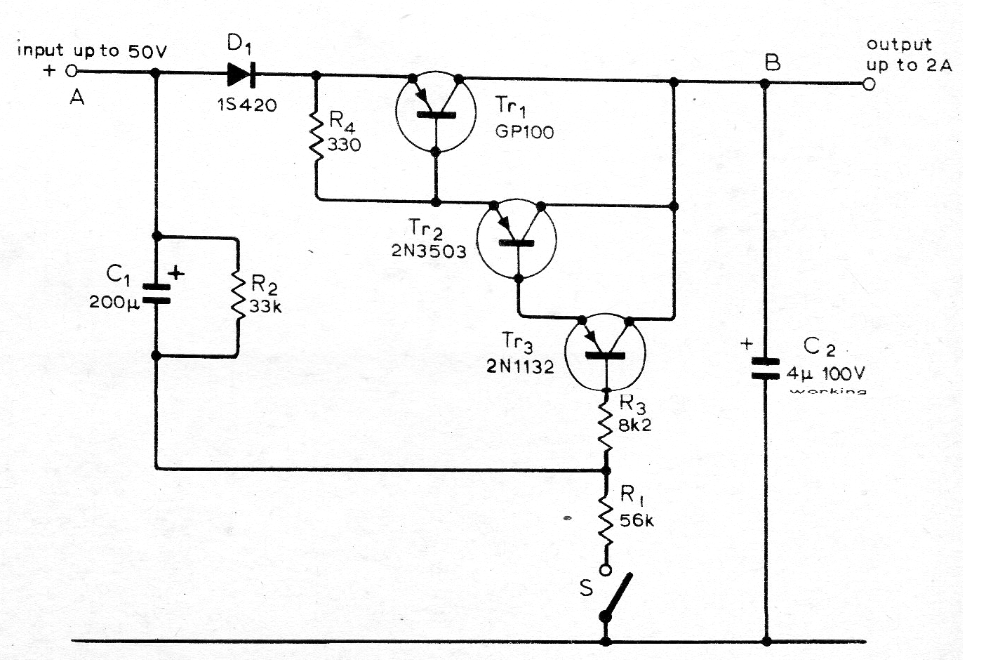 Este circuito fue obtenido en una revista de 1975, pero puede ser montado con facilidad aún, pues los componentes son comunes. TR1 puede ser el TIP42, TR2 el BD136 y TR3 el BC558, esto para corrientes hasta 2 A y tensiones de entrada hasta unos 25 V. Para tensiones mayores, se deben usar los transistores originales. El diodo puede ser el 1N5404.