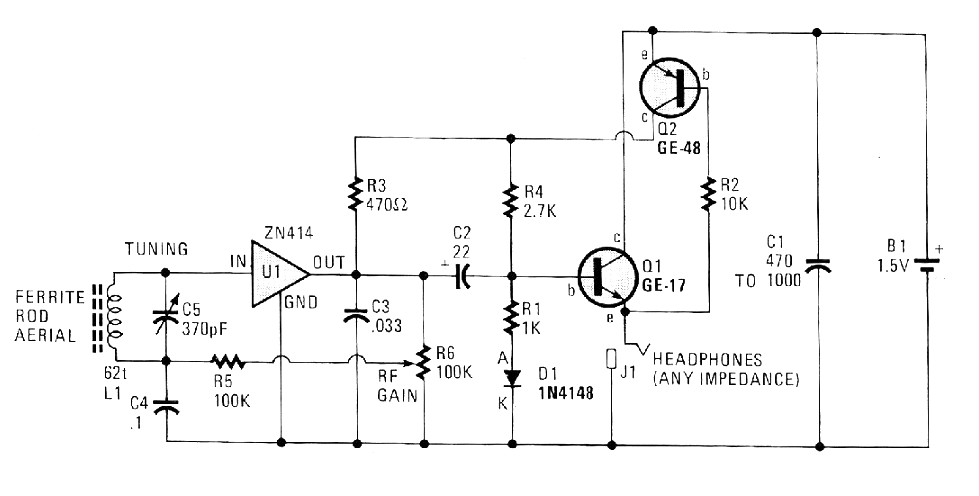 Este circuito se obtuvo en un Hands On Electronics, revista americana de enero de 1987. El ZN414 no es muy fácil de obtener, pero si el reproductor consigue puede montar un excelente radón de ondas medias para escuchar en auricular. La alimentación es hecha por una pila y la bobina consta de 80 a 100 vueltas de hilo de 32 a 28 en un bastón de ferrita. El capacitor de sintonía se puede obtener en un radito transistor fuera de uso. Este circuito tiene un paso amplificador que puede ser elaborado con los transistores BC558 y BC548.