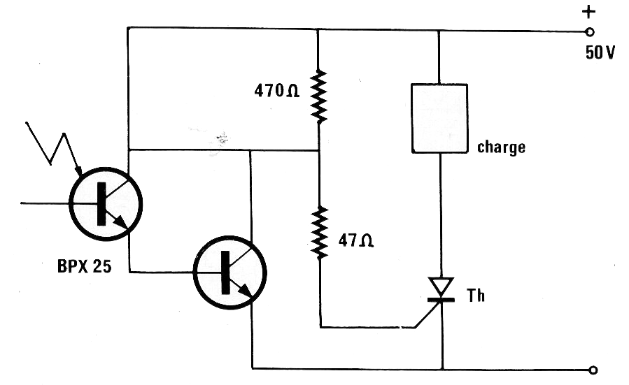 Este circuito fue obtenido en una revista Electronque Loisirs de Francia, en una edición de julio de 1991. En él tenemos una configuración para disparo de un SCR con un foto-transistor. El SCR puede ser el TIC106 y el transistor un BC548.
