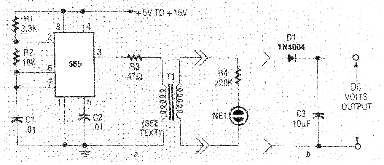 Este circuito es de una Electronics Now, americana de diciembre de 1992. La revista ya no existe, pero el circuito se puede montar fácilmente, ya que todos los componentes son comunes. El circuito genera una alta tensión que hace que una lámpara de neón parpadeante. El transformador puede ser del tipo de alimentación con bobina de baja de 6 a 9 V y corriente entre 100 y 300 mA.